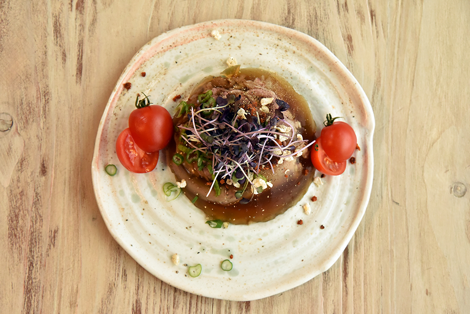 Kerül még hozzá karikára vágott újhagyma, a frissesség és roppanósság jegyében, végül némi koktélparadicsom és egy kis kazal retekcsíra. A tálalási élményt fokozza, ha háttér színe szépen kirajzolja a kocsonya és tartozékai kontúrját, és színben is passzol hozzá, így most Ruzicska Tünde kerámiaművész műhelyéből választottunk egy egyedi darabot.