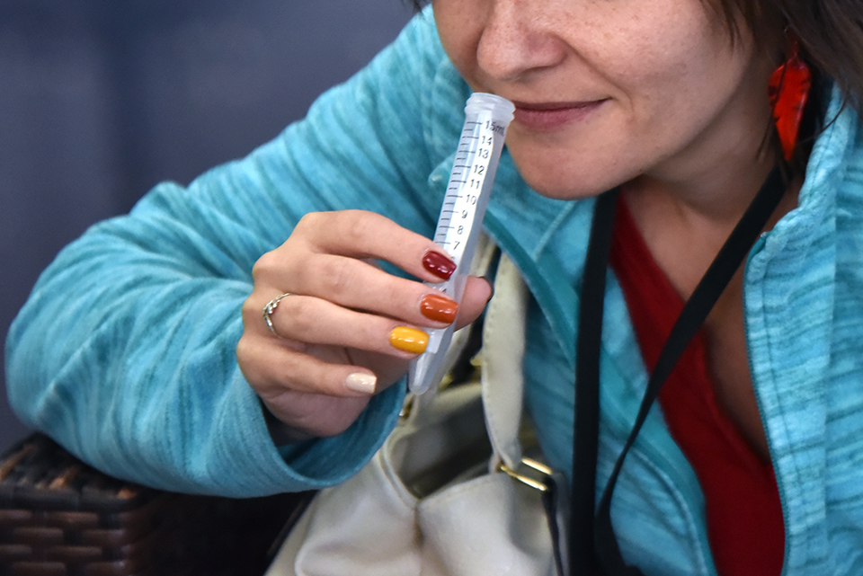 Nagyon vártuk az előzetesen beharangozott, hibás borok felismerését célzó feladatokat, ám sajnos ilyen program ottjártunkkor nem volt. Helyette különböző illatokat ismerhettünk fel egy másik állomáson. A kémcsőbe helyezett papírcsíkokra permetezett illatok felismerésében nem teljesített rosszul csapatunk, a málnát, a mézet, a karamellt, a sárgadinnyét könnyűszerrel detektáltuk.