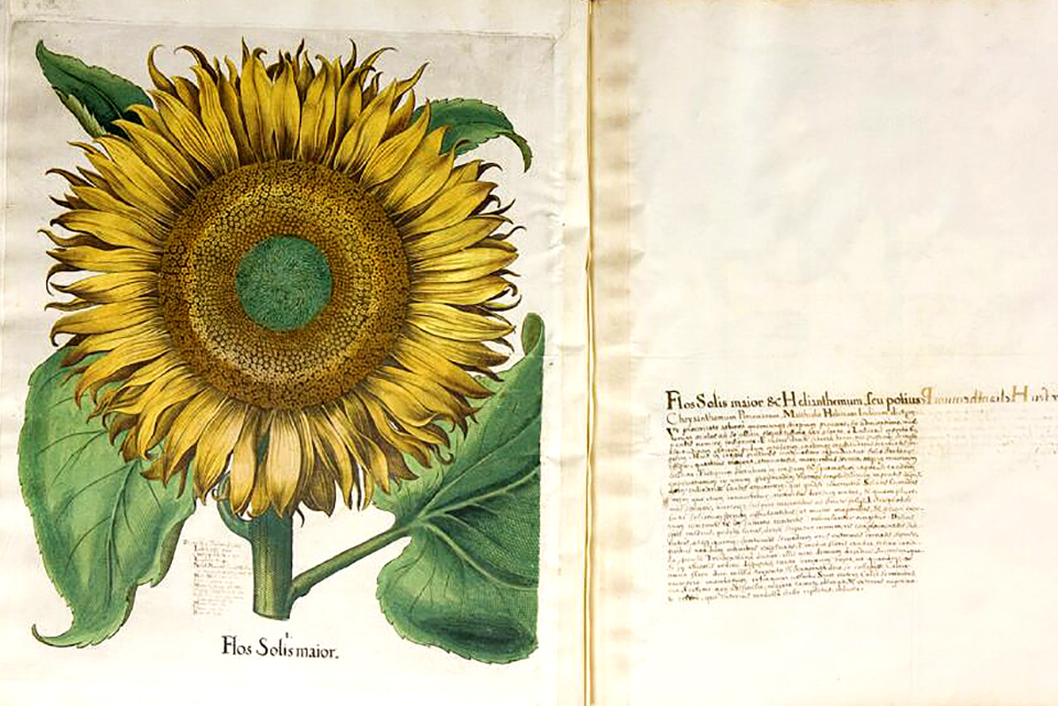 Flos Solis Peruvianus („a nap Peruból származó virága”) In: Petrus Andreas Matthiolus: Kreutterbuch. Franckfurt am Mayn, 1586. (Kép forrása: MNM KK Semmelweis Orvostörténeti Múzeum, Könyvtár és Adattár, Régi Könyvgyűjtemény. Fotó: Blahák Eszter)