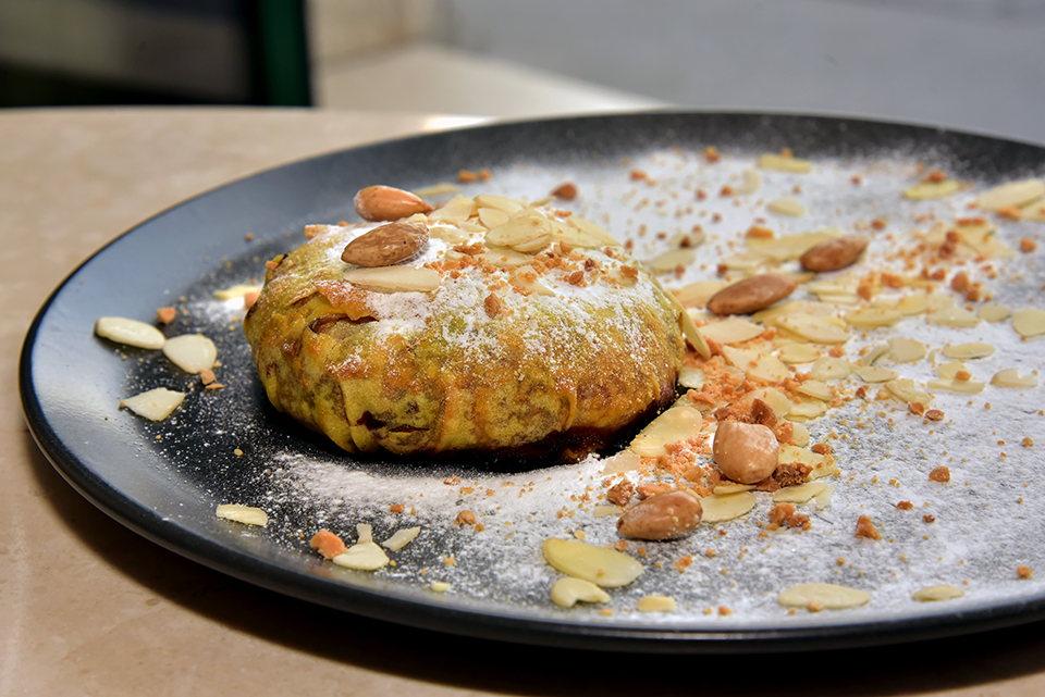Mesésen ropog a tészta, ahogy kettészeljük a késsel, egyben frenetikus illat szabadul fel a pite belsejéből: fahéj, szegfűszeg, sáfrány, kurkuma, gyömbér, narancsvirág, akárcsak egy karácsonyi sütemény – de hiszen fűszerfronton minden adott is hozzá. A séftől később megtudjuk: a vendégek először visszahőkölnek az étel összetevőinek olvasatán, de amikor mégis sikerül őket meggyőzni, a megosztónak tűnő ételre azt mondják: mi ez a nagyszerű fogás?!